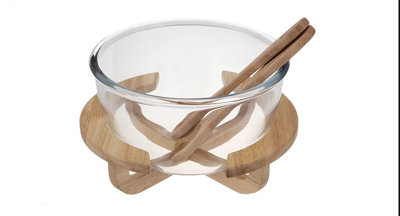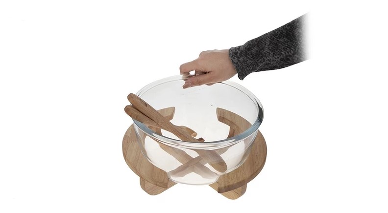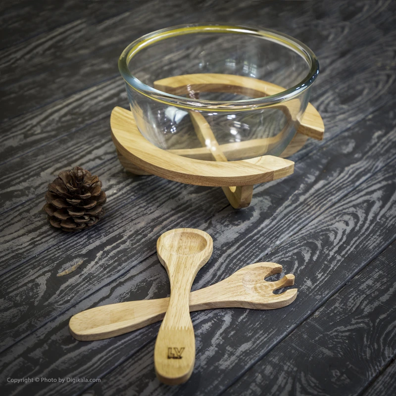 سایر توضیحات- جنس کاسه: شیشه - وزن: ۱۴۲۵ گرم - جنس پایه: چوبی - وزن پایه: ۲۹۰ گرم - به همراه قاشق و چنگال چوبی - ابعاد قاشق: ۱ × ۶ × ۲۳ سانتیمتر و وزن: ۵۵ گرم - ابعاد چنگال: ۱ × ۶ × ۲۳ سانتیمتر و وزن: ۴۵ گرم - دستساز - عمر طولانی - احتمال وجود اختلاف رنگی به دلیل ساختار چوبی محصول