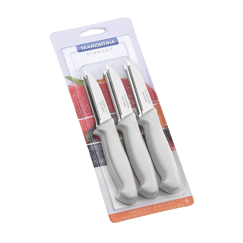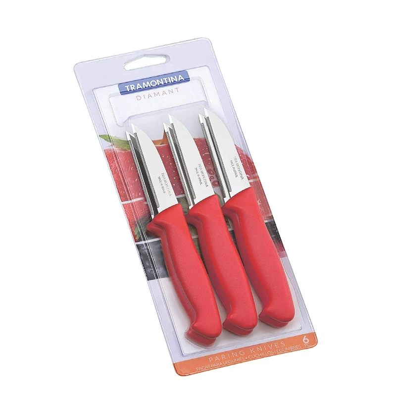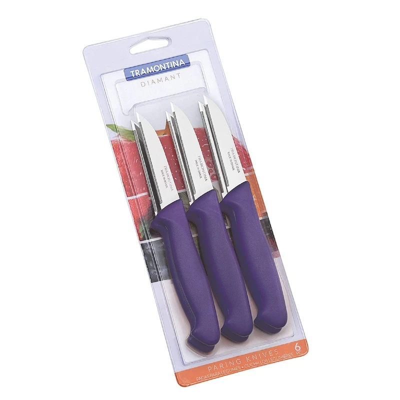 ترامونتینا یکی از با سابقه ترین شرکت های تولید کننده کارد و چنگال است. یکی از کالکشن ها بی نظیر با طراحی سبک و تیغه استیل استنلیس با کیفیت،کالکشن دیامونت می باشد. کارد اره ای میوه خوری 6 تایی دیامونت ترامونتینا در 5 رنگ مختلف و جذاب سفید،نارنجی،قرمز،آبی و بنفش تولید شده است. دسته های این کارد از جنس پلی پروپیلین ضد حساسیت و آنتی باکتریال است و به هیچ عنوان شکسته و یا از تیغه جدا نمی شود. این محصول دارای تیغه بسیار تیز اره ای از جنس استیل استنلیس کربن دار می باشد. برای داشتن کارد بسیار با کیفیت و عمری، ست کارد های دیامونت را به شما پیشنهاد می دهیم.