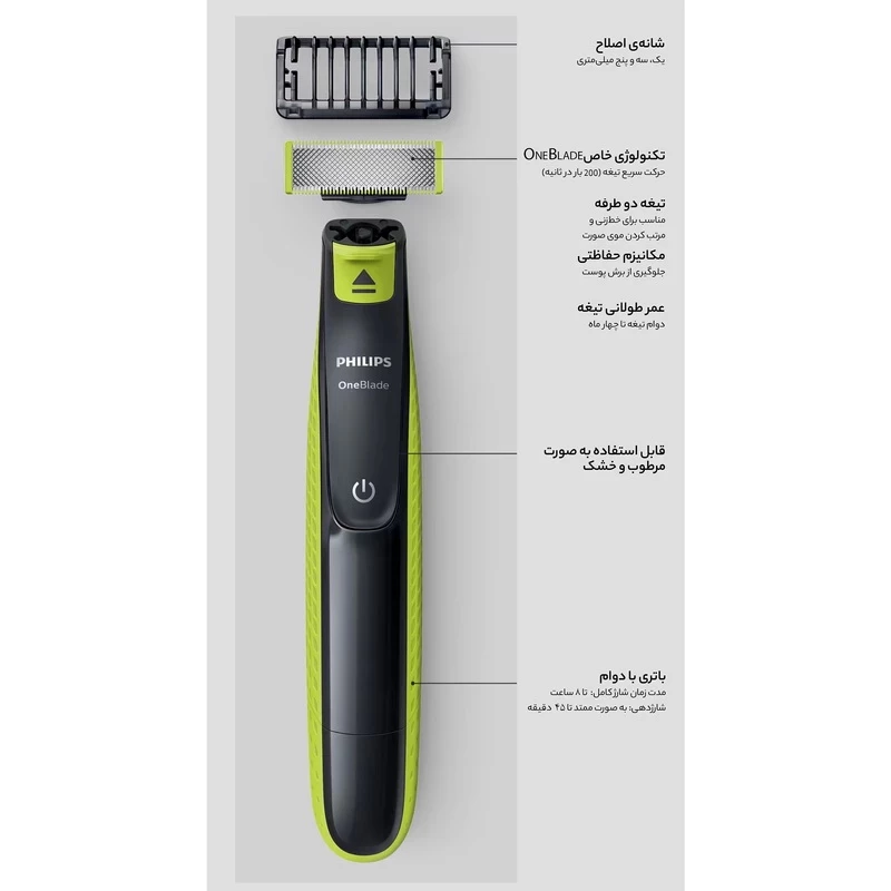 به لطف سیستم حفاظتی دوگانهی این ماشین، امکان نزدیک کردن ریش تراش به پوست برای از بین بردن تمامی موها امکانذیر است. همچنین سر برس ماشین اصلاح موی صورت و بدن فیلیپس مدل OneBlade Sensitive قابلیت چرخش دارد و اجازه میدهد تا شکل گرد صورت خود را به راحتی توسط این ماشین دنبال کنید. علاوه بر این، برخلاف تیغهای سر ثابت، این دستگاه با خطوط روی صورت کاملاً سازگار است و فشار بیش از حد را کاهش میدهد تا سوزش صورت به حداقل برسد. تیغه های اصلی روی این ماشین دارای خاصیت ضد زنگ هستند که همین خاصیت به عدم کند شدن آنها کمک شایانی میکند. همچنین این تیغه از جنس بسیار مرغوبی ساخته شده و تا مدتهای طولانی بدون خرابی یا کند شدن میتواند کارایی داشته باشد. این ماشین اصلاح دارای باتری داخلی قابل شارژ با ظرفیت بالا است که طی هشت ساعت به صورت کامل شارژ شده و میتواند تا 45 دقیقه به صورت مداوم شارژدهی داشته باشد. دستگاههای اصلاح ضد آب در چندین سال اخیر به محبوبیت فراوانی دست پیدا کردهاند و این امر فرآیند اصلاح صورت را تا حدود زیادی راحتتر کرده است. ماشین اصلاح موی صورت و بدن فیلیپس مدل OneBlade Sensitive دارای طراحی مقاوم در برابر آب است که نه تنها شستن سری آن را با آب ممکن میسازد، بلکه برای راحتی بیشتر امکان استفاده به صورت مرطوب را هم در خود میبیند.همچنین به همراه این ماشین اصلاح روغن مخصوص پوست صورت اراِئه میشود که باعث نرمی و لطافت هرچه بیشتر پوست صورت میشود.