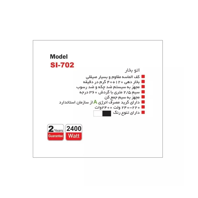 اتو بخار پارس خزر مدل SI-702 اتو بخار پارس خزر مدل SI-702 یک ابزار کاربردی برای اتو کردن لباسها است. این اتو دارای امکانات بخاردهی عمودی است که به شما امکان میدهد لباسها را به راحتی و با دقت بیشتری اتو کنید. همچنین، این اتو دارای ویژگی ضد فرسودگی است که باعث میشود مدت طولانیتری بتوانید از آن استفاده کنید. سیستم ضد رسوب این اتو هم از مزایای دیگر آن است که باعث میشود تا برای شما آسانتر باشد تا از این اتو استفاده کنید و همچنین تا از عمر طولانیتری برخوردار باشد. بهطور کلی، اتو بخار پارس خزر مدل SI-702 یک ابزار حرفهای و کارآمد برای اتو کردن لباسها است که با ویژگیهای خاص خود، تجربه بهتری را برای شما فراهم میکند. این اتو بخار وزن 2500 گرم و ظرفیت مخزن آب 300 میلیلیتر دارد. با حداکثر توان مصرفی 2400 وات و طول کابل 2.1 متر، این محصول توانایی اتوکشی موثر و آسان را دارد. معرفی اتو بخار پارس خزر مدل SI-702 این اتو بخار دارای وزن 2500 گرم است و سیستمهای ضد فرسودگی و ضد رسوب دارد که باعث افزایش عمر مفید و کارایی بالای این محصول میشود. همچنین دارای کفههای استیل با طول کابل 2. 5 متر است که این ویژگیها باعث افزایش عمر مفید و کارایی بالای این محصول میشود. اتو بخار پارس خزر مدل SI-702 دارای امکان بخاردهی عمودی است که از آن میتوان برای اتو کردن لباسهای آویزان استفاده کرد. این ویژگی بسیار منحصر به فرد و کاربردی است و کاربران از آن استفاده زیادی میکنند. این اتو بخار دارای امکاناتی مانند ضد فرسودگی است که باعث افزایش عمر مفید و کارایی بالای این اتو بخار میشود. همچنین این اتو بخار سیستم ضد رسوب دارد که باعث افزایش عمر مفید و کارایی بالای این محصول میشود.