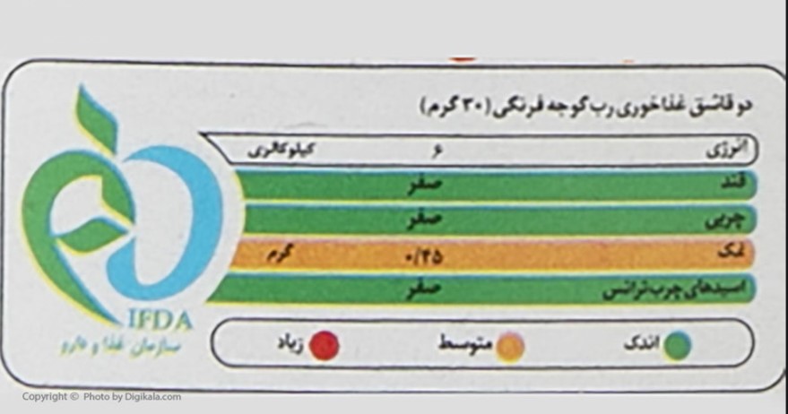 - ارزش غذایی دو قاشق غذاخوری رب گوجه فرنگی (۳۰گرم): - انرژی: ۶ کیلو کالری - قند: ۰ گرم - چربی: ۰ گرم - نمک: ۰.۴۵ گرم - اسید های چرب ترانس: ۰ گرم